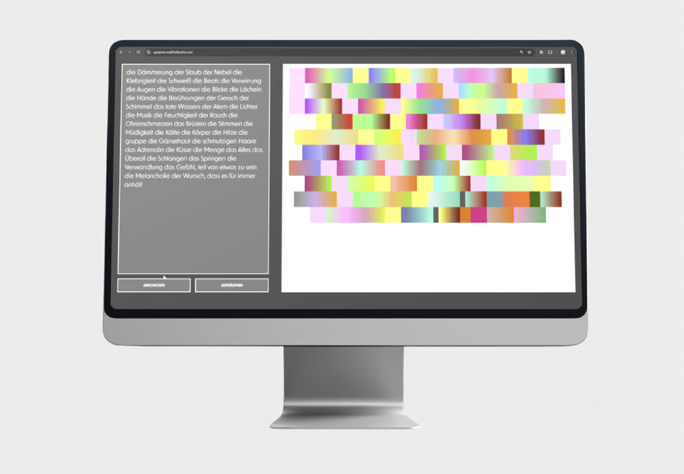 Im Projekt entwickelte ich ein System, das Text in Farben codiert und diese wiederum in Töne umwandelt. Dieser Ansatz verdeutlicht die Wechselwirkung verschiedener Elemente und die Übersetzung abstrakter Inhalte in unterschiedliche Sinneswahrnehmungen.